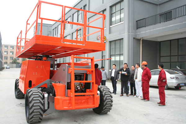 鼎力GTBZ16SU自行走桥式举升作业平台,通过了一系列苛刻测试,开始小批量投产。首批4台GTBZ16SU自行走桥式举升作业平台陆续使下装配线,即将交付客户投入使用。公司董事长许树根亲临现场,兴致勃勃的观看了该设备的功能演示。