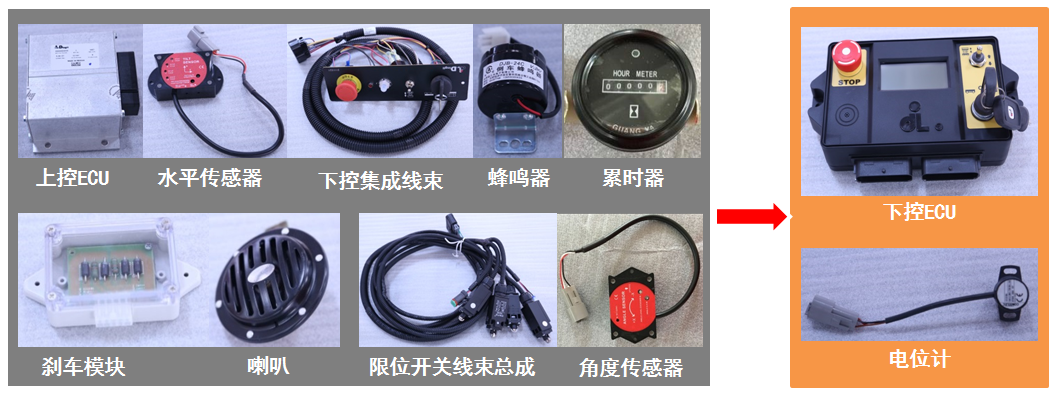 a、下控ECU集成冗余水平传感器、按钮开关、钥匙开关、急停开关、蜂鸣器、累时器、触摸显示屏、内置安全保险于一体;