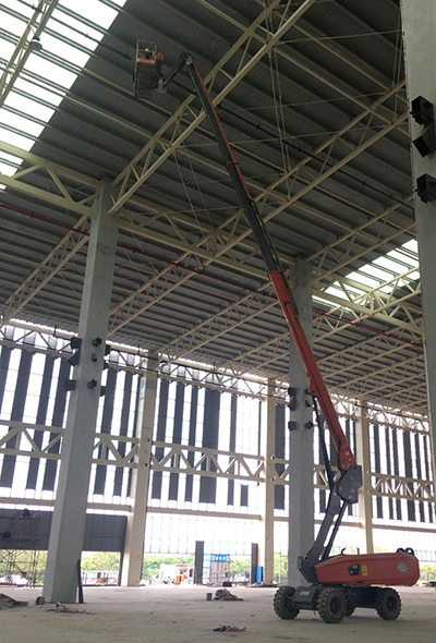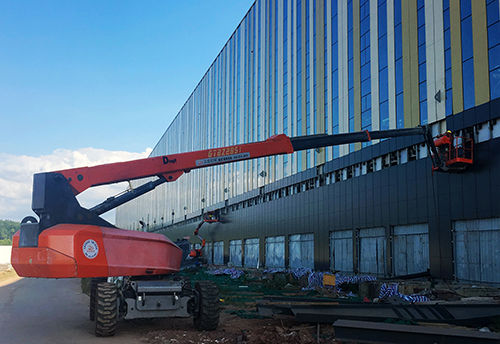 在该项目中,鼎力高空作业平台参与了幕墙、强弱电、消防、设备安装等工程,还包括后续内部装修等。日复一日,鼎力高空作业平台凭借灵活、修长、有力的铁臂在芙蓉国的朝晖中伸展自如、只争朝夕,诠释着安全与高效,释放着速度与激情。 本次服务于长株潭烟草物流园项目的是鼎力GTBZ18A和GTBZ28SI。GTBZ18A工作高度18m,平台载重230kg,水平延伸8.85m,跨越高度8.45m,小臂130°变幅,操作灵活方便。GTBZ28SI工作高度27.90m,水平伸距20.00m,工作载荷230kg,四轮驱动使其具备灵活的机动性,摆动桥底盘,40%的爬坡能力,转台360度回转,可方便跨越地面障碍物进行远距离作业,特别适合建筑业和工业应用。 长株潭烟草物流园是全国烟草商业系统投资最大的单体物流项目,也是国家烟草专卖局在长沙布局的重大项目。该项目建成后,将成为覆盖长沙、株洲、湘潭等多个城市的信息化、自动化、智能化的烟草物流园。相信在鼎力高空作业平台的倾力参与下,长株潭烟草物流园一定会成为长株潭两型社会试验区现代物流的示范工程。 作为国内高空作业平台大型企业和本行业的上市企业,浙江鼎力专注各类智能高空作业平台研发制造,持续推出高端前沿产品,引领设备智能升级,推动行业快速发展,用铮铮铁臂托起高空作业安全高效的梦想。