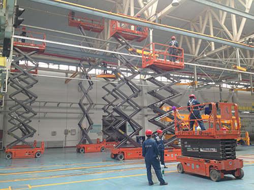 现在,距大会召开仅有4个多月时间,会址按要求力争在8月底建成。时间紧,任务重。工程涉及大量复杂的高空作业,如果用脚手架,搭拆都费时费力,工作时又不方便,并且效率一般。而高空作业平台则优势明显:升降灵活,操作人员可轻松进出受限空间;机动性极强,能够便捷迅速转换作业地点,尤其适用于多点位高空作业。