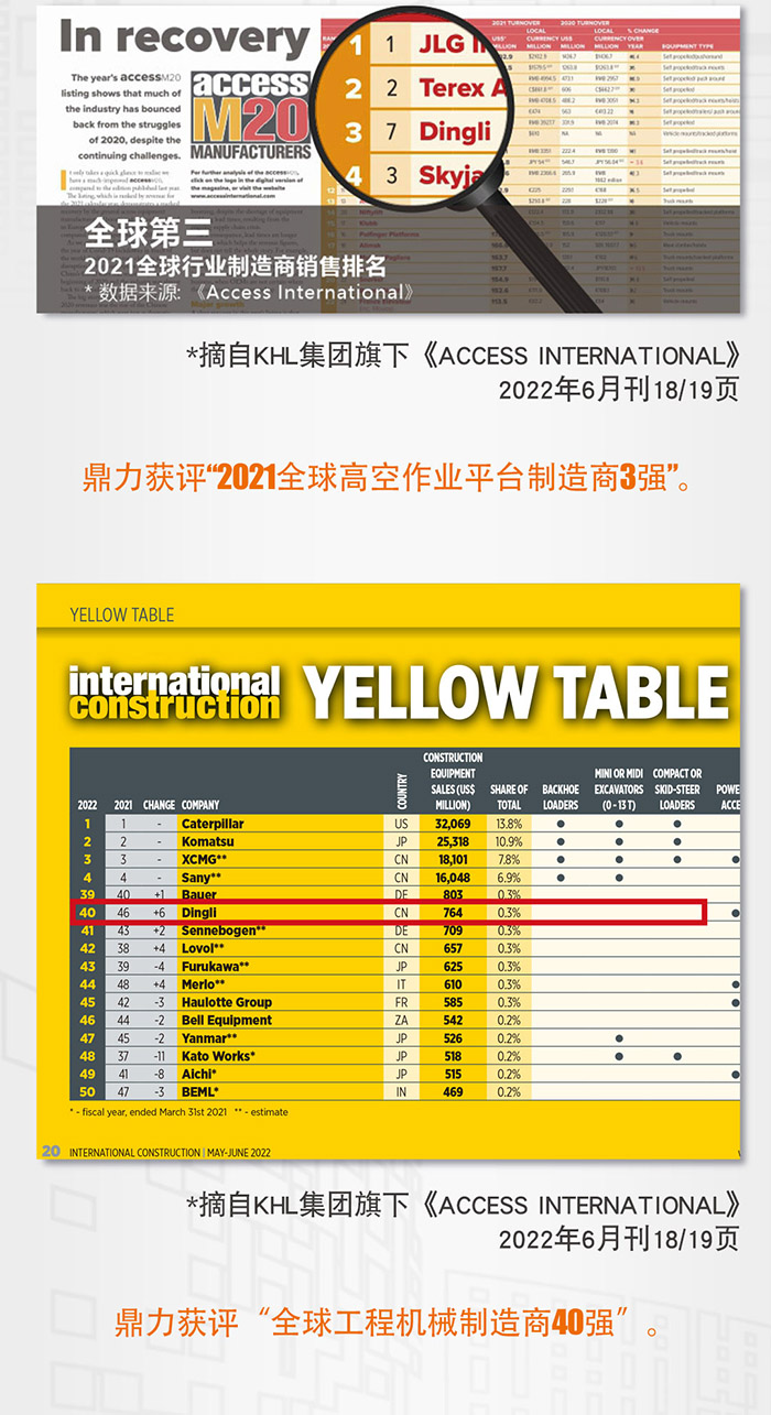 全球高空作业平台制造商3强,以高空作业平台单项荣登全球工程机械制造商第40位。