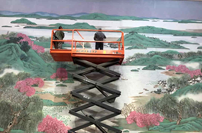 究竟是什么问题,让陈琪画家忧心忡忡,记者打听到原来问题就在于这幅画太高大了。画本身的难度可以克服,难在后续上墙后,要修饰这么高大的一幅画不容易。陈琪表示,对于这个大作,他不敢怠慢,所以上墙后爬上爬下的观看修饰的次数要比以往作画多得多,面对如此巨幅画作,搭建传统的脚手架肯定不现实,一来所花费的时间会多出许多,耽误工期;二来左右移动进行作画不方便,画作本身品质难保证,这可如何是好?好在,得知这一情况后,浙江鼎力机械股份有限公司第一时间拿出了其自主研发的剪叉式高空作业平台产品,为陈琪画家一行解决了燃眉之急。