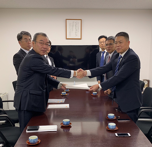 一直以来,两家企业就有着密切的战略合作关系。借此庆典契机,为进一步开展合作,浙江鼎力董事长许树根与新日本建贩株式会社社长进行了会面,并签订代理协议。