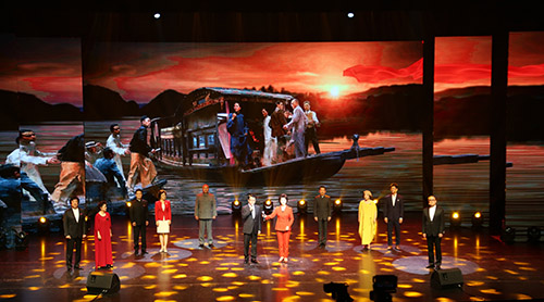 在全场观众的齐声合唱下,《没有共产党就没有新中国》的豪迈歌声响彻整个会场。