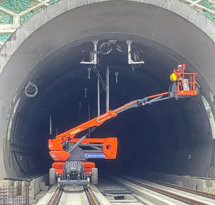 在大型基建项目中 糖心视频观看,轨道运输是提升效率的关键,鼎力轨道高空车专为隧道内作业设计,具备400kg荷载能力,12km/h的行驶速度,可快速完成设备转运和人员输送,适应复杂施工环境。